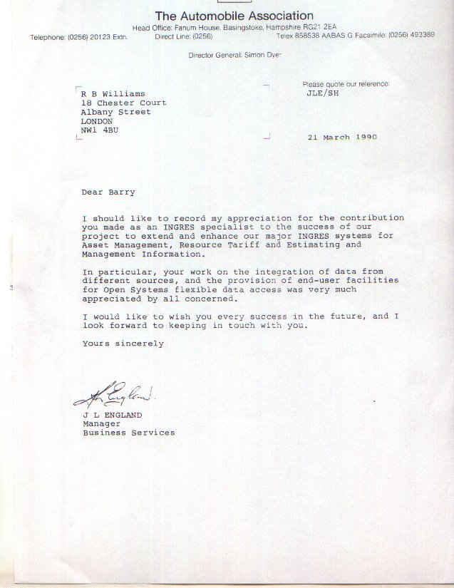 Letter of Appreciation from the Automobile Association (AA) - Nr.1